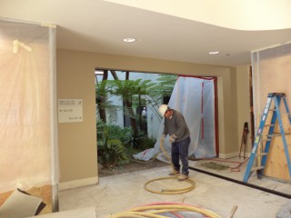 A large portion of the lobby area has been barricaded for safety purposes, and the windows to the atrium have been removed to make way for the new sliding glass doors.