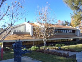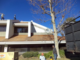 Here is the front of the building along Agoura Road. The Spanish tile roof is removed and the roof coverings at the corners have been removed. Before the rains, the crew was able to waterproof the roof.